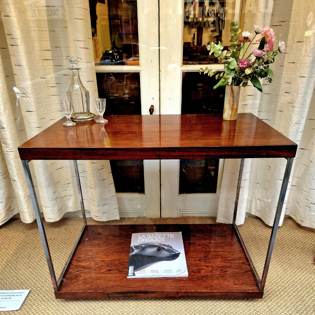 Un objet pratique au charme de l’ancien : ses roulettes et barres chromées portent les traces du temps. Son placage audacieux en palissandre, bois exotique venu de contrées lointaines comme le Brésil, lui confère caractère et élégance.