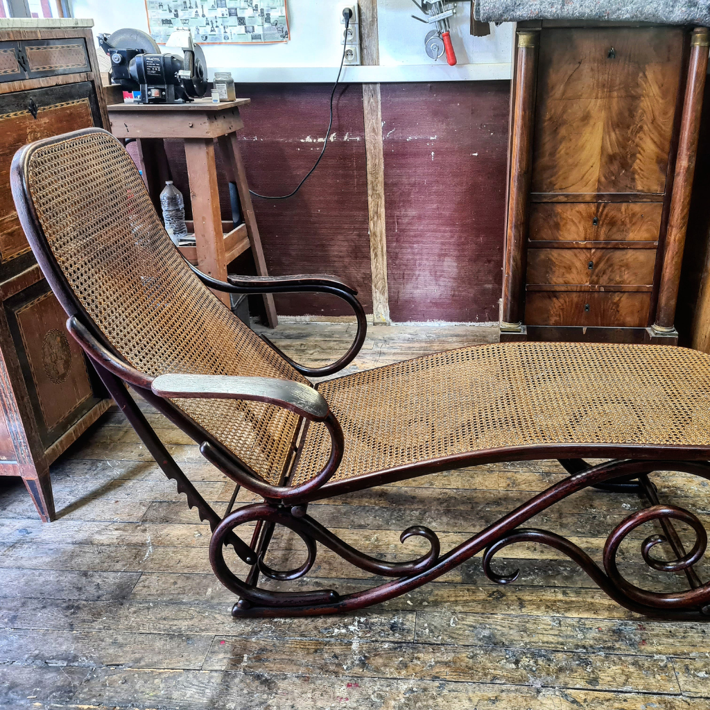 Un modèle rare qui illustre le savoir-faire de l’entreprise de Michael Thonet, qui au début du XXe siècle a lancé la fabrication de  mobilier en série à Vienne en Autriche, en bois courbé.